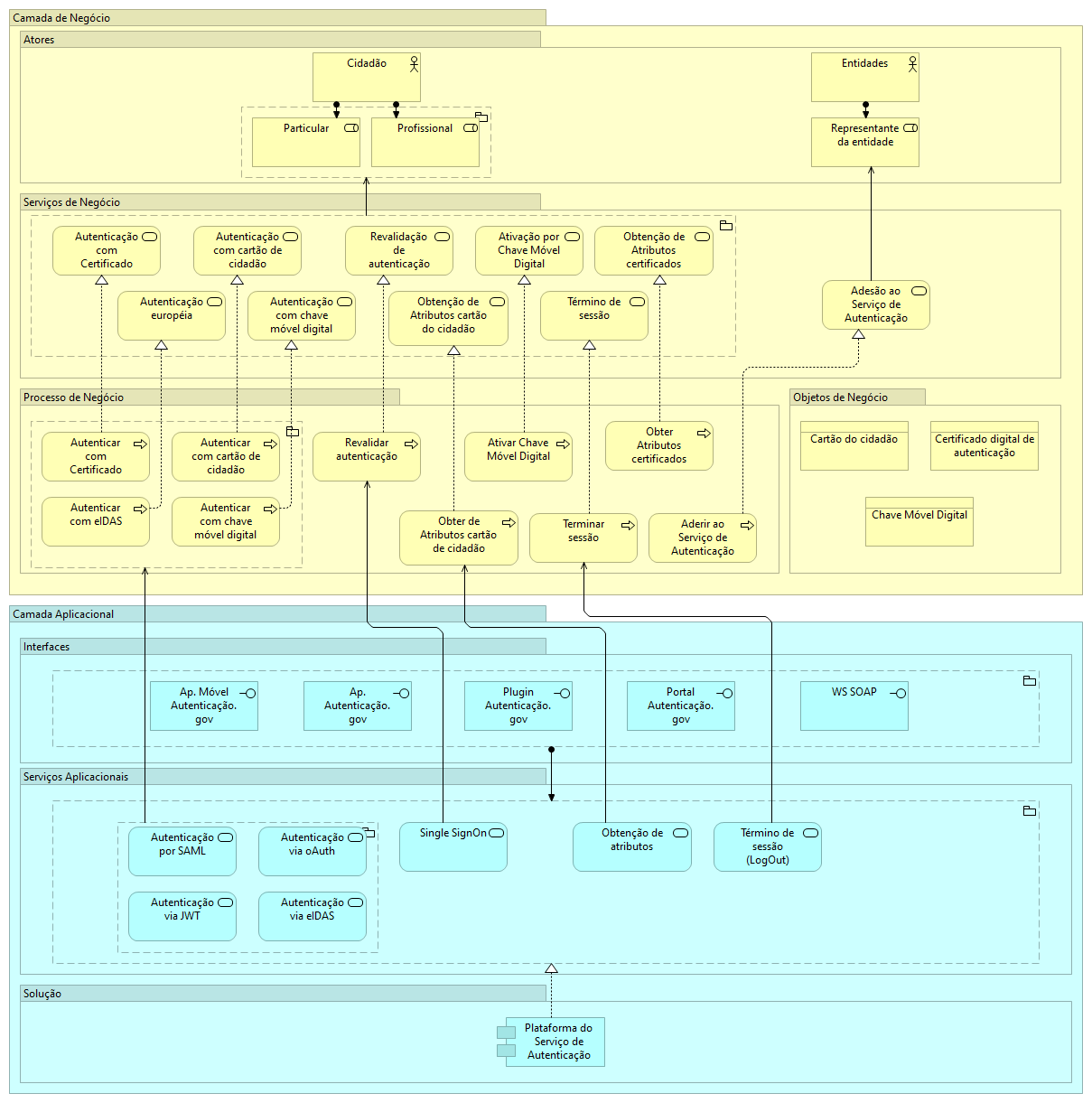 Abaixo o diagrama de alto nível do com o Serviço de Autenticação, demonstrando na Camada de Negócio os atores e papéis envolvidos, os serviços de negócio e os processos, e na Camada Aplicacional os serviços aplicacionais que realizam seus processos.