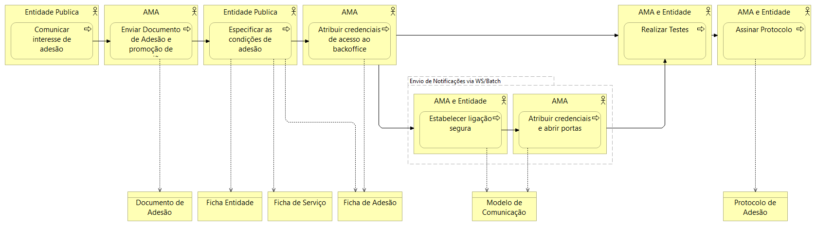 | **3.** Especificar as condições de adesão               | Entidade Aderente        | <p>Caracterização da Entidade, identificação dos serviços a aderir, e pretensão de utilizar apenas o b<em>ackoffice</em> das Entidades (<a href="https://entity.notificacoes.eportugal.gov.pt/"><https://entity.notificacoes.eportugal.gov.pt/></a>) para envio de notificações avulso, ou se também pretendem o modelo de envio de notificações por interoperabilidade com os sistemas de informação da Entidade Aderente (<em>WS/Batch</em>).  </p><p>Identificação de todos os elementos da Entidade Aderente que deverão ter acesso ao <em>backoffice</em> das Entidades.</p> |